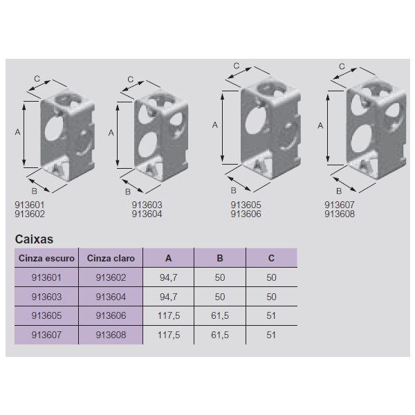 Caixas desmontáveis em dois tamanhos, com 5 ou 6 entradas para eletrodutos e exclusiva entrada para canaleta 20x12. Produzido em PVC rígido anti-chama, com ampla gama de acessórios. Nas cores cinza escuro RAL 7031 e cinza claro RAL 7035.