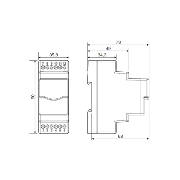 Caixa em ABS V0, 35 x 90 mm, padrão disjuntor, com fixação por trilho DIN 35 mm.
