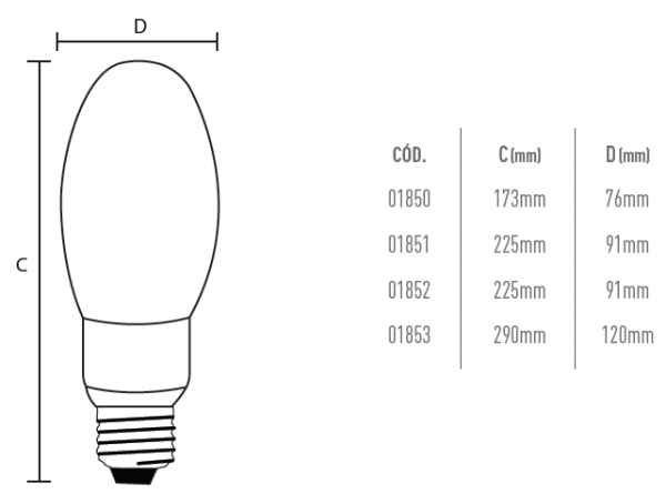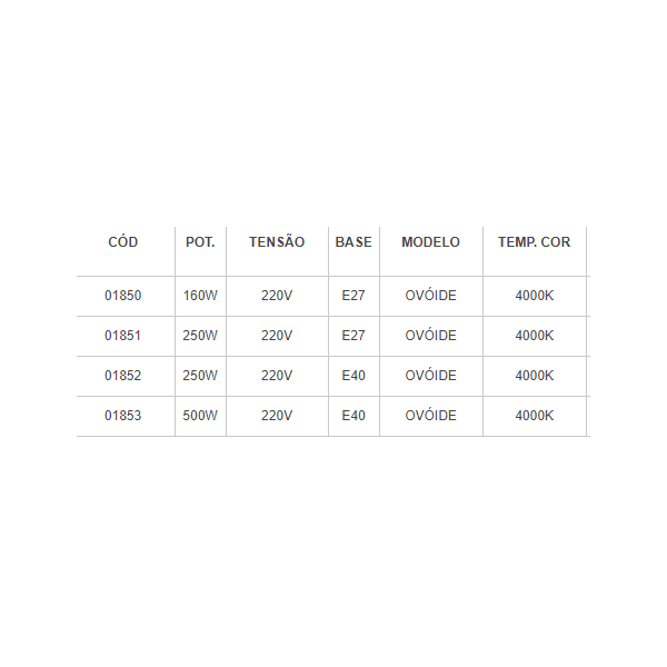 Ideal para iluminação pública, industrial e para substituir lâmpadas incandescentes de alta potência. Tensão: somente 220V. Não requer reator. Posicionar num ângulo de 30°em relação a vertical o modelo de 160W. Os demais funcionam em qualquer posição. Padrão de qualidade ISO9001.