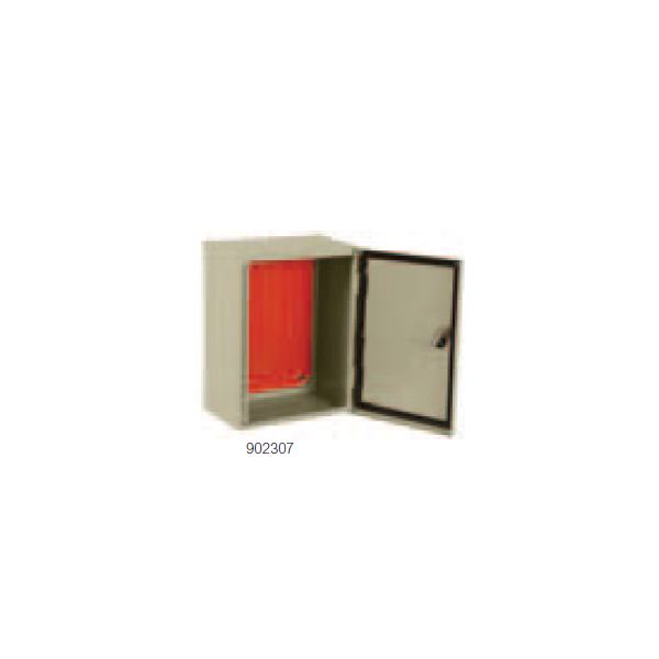 Caixa e porta na cor bege RAL 7032. Placa de montagem na cor laranja RAL 2004.