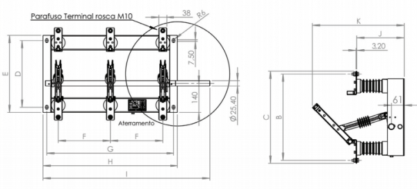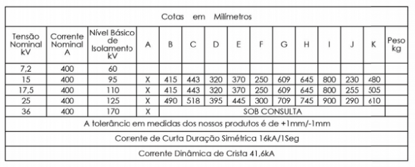 As chaves seccionadoras são fabricadas para as tensões de 7,2kV a 36,2kV, correntes nominais de 200 a 1600A e curto circuito simétrico até 40kA.